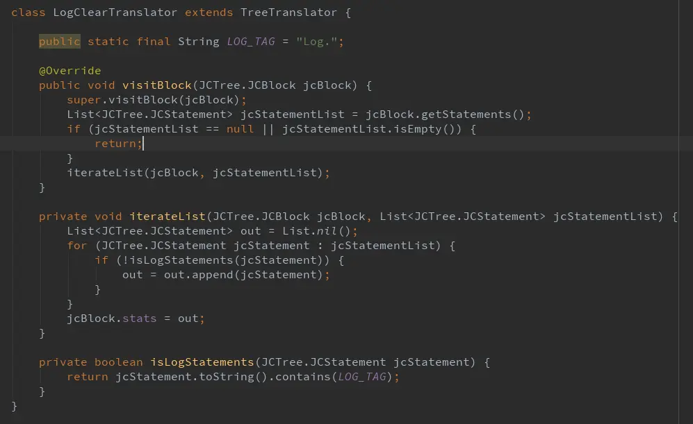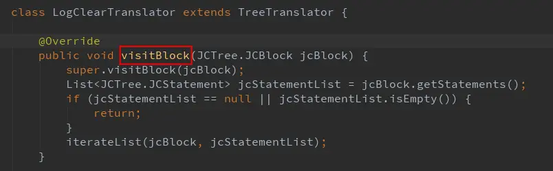 回到我们的需求场景:扫描所有 log 语句,既然是语句,粒度应该为语句块,所以我们覆写 visitBlock 进行扫描,当扫描到指定语句比如 Log. 时,就不把整个语句都写入 AST,以此达到清除 log 语句的效果。
