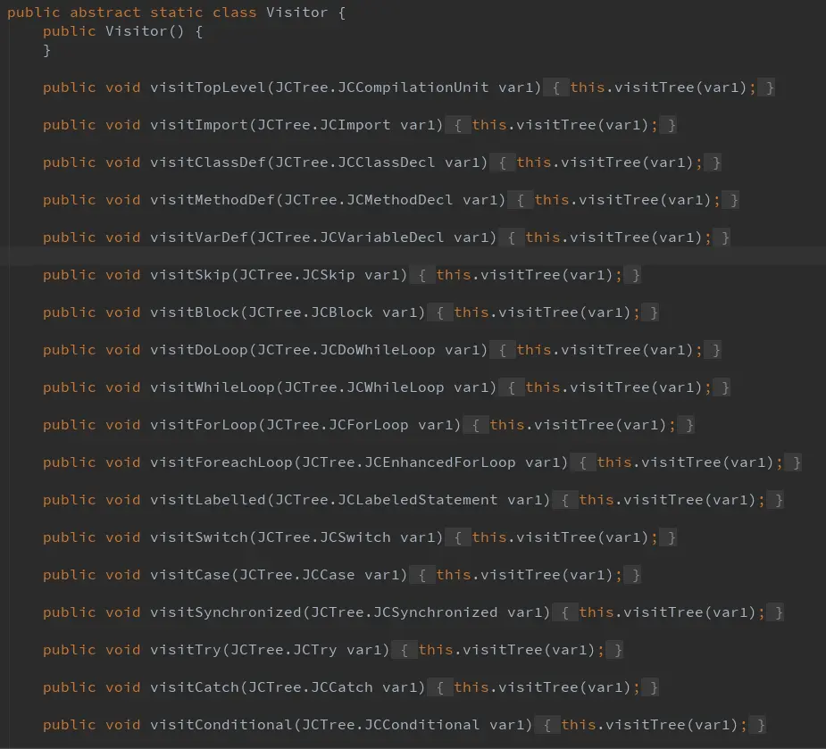 所有 visit 方法一目了然,我们前面提到 AST 每一个节点都代表着源语言中的一个语法结构,所以我们可以细粒度到指定访问 if、return、try等特定类型节点,只需覆写相应的 visit 方法。