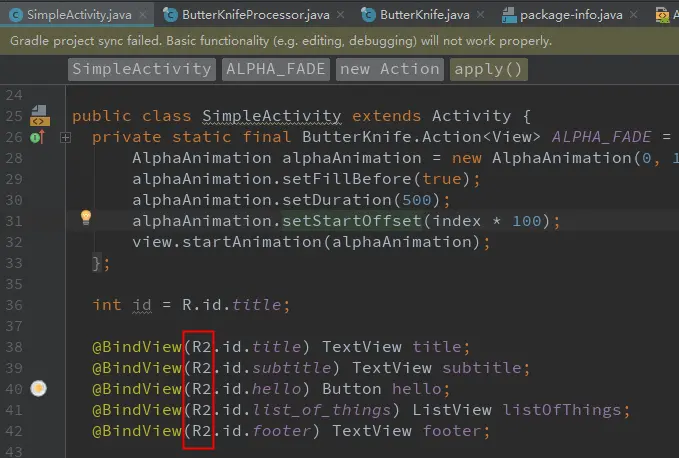 细心的你会发现在 ButterKnife 的 sample-library 中,注解的都是引用了 R2 :