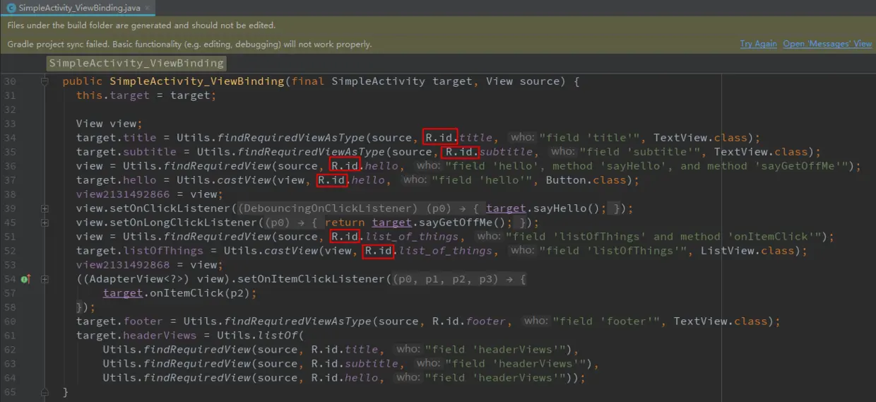 那我们生成 R2 供编译期使用,在生成代码阶段把 R2 替换成 R 不就行了?好主意!J 神的思路就是这样的!我们打开生成的 XXX_ViewBinding 文件就可以发现 —— R2 已经被换成了 R。