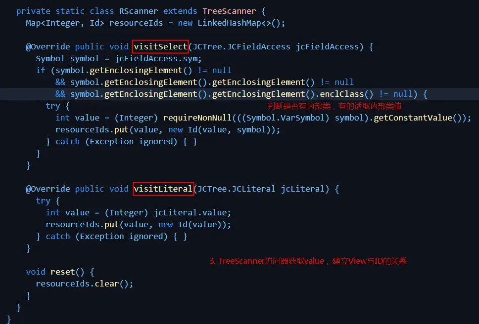 - 在扫描资源时,获取 Element AST 树,注入自定义的 TreeScanner 访问器 RScanner 来访问子节点;