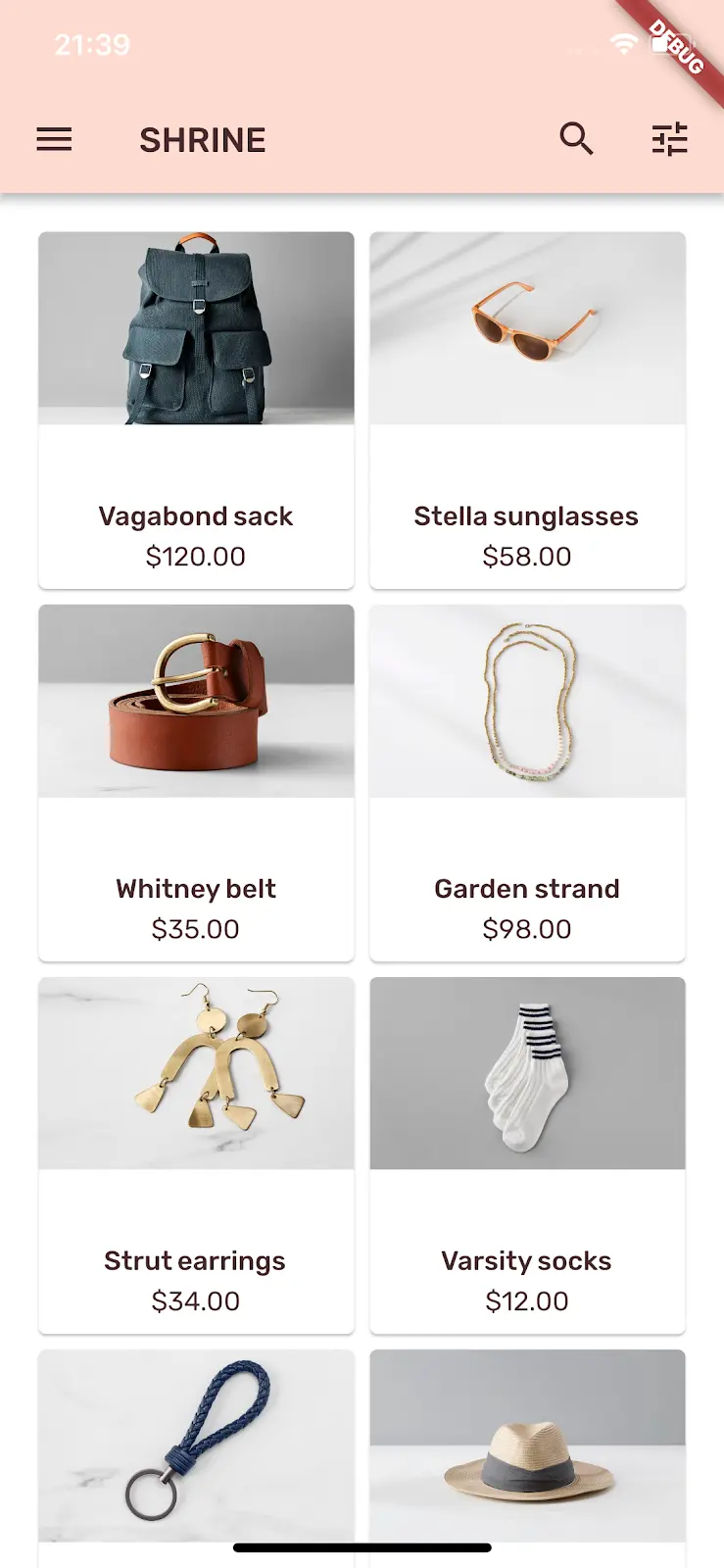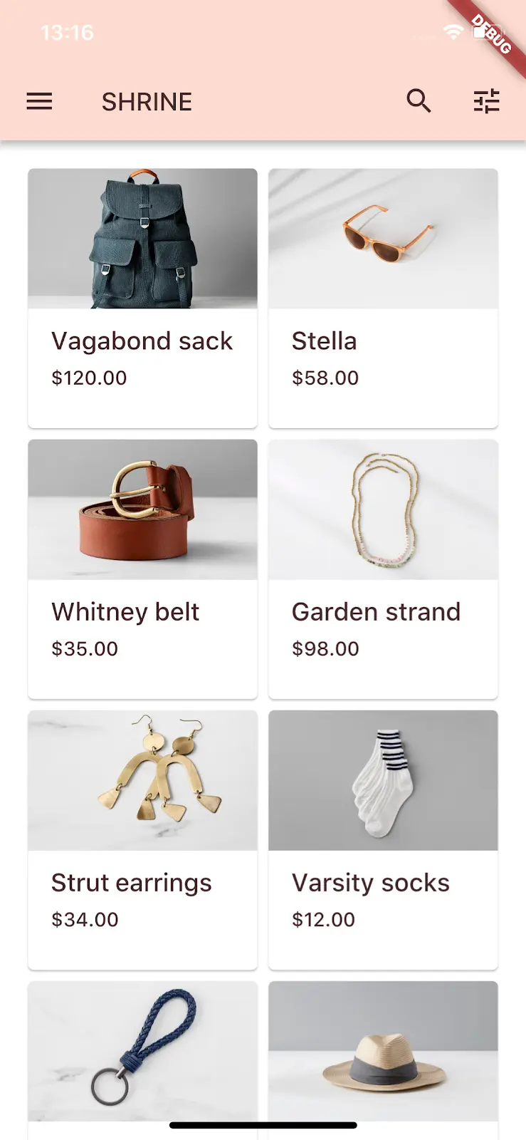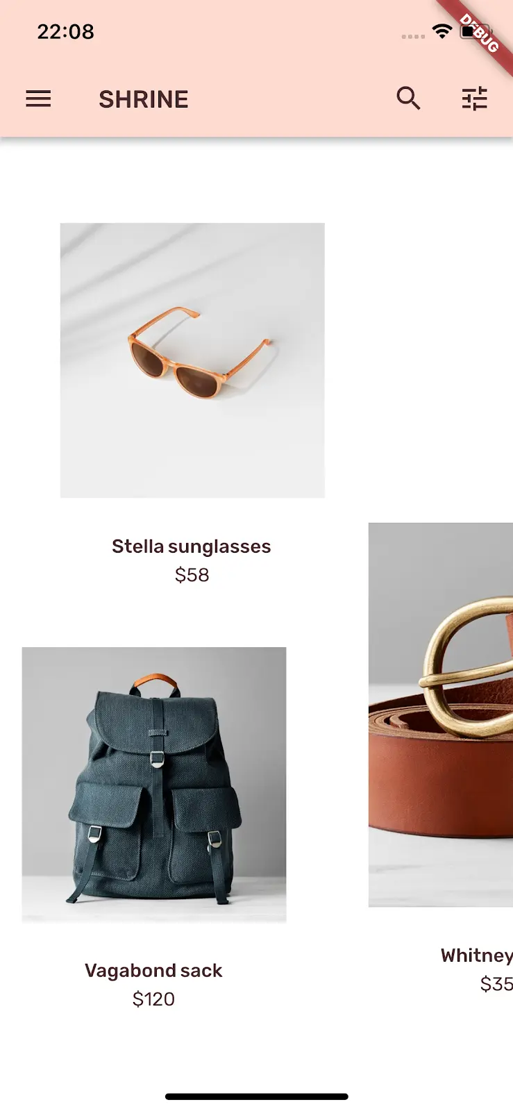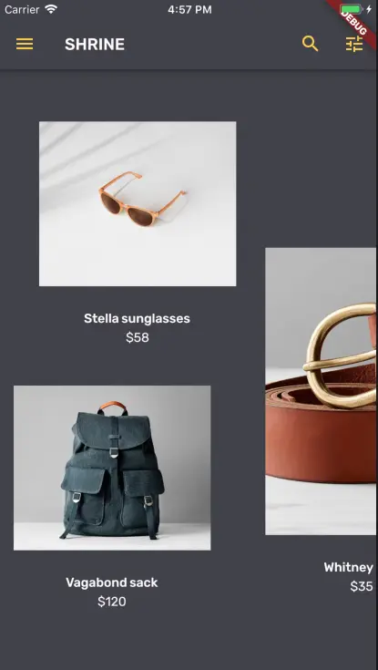 现在产品以编织图案风格水平滚动。此外状态栏文本(顶部的时间和网络)现在为黑色。那是因为我们将 AppBar 的 brightness 改为了 light,brightness: Brightness.light