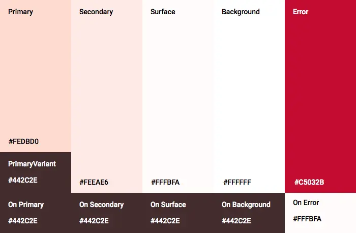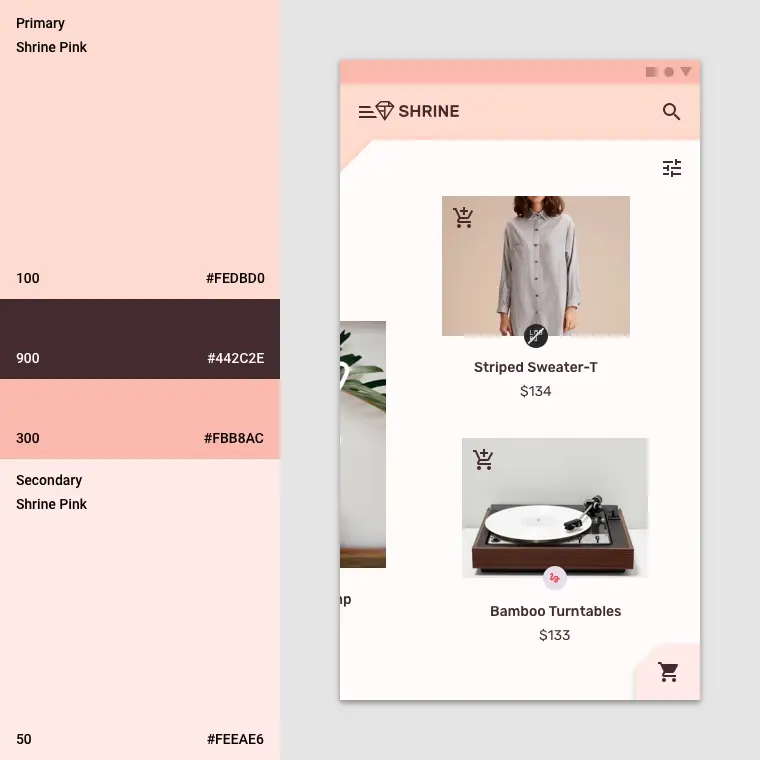 一个代表着 Shrine 品牌的配色方案已经创建好了。设计师希望你在 Shrine 应用中实现这个配色方案。