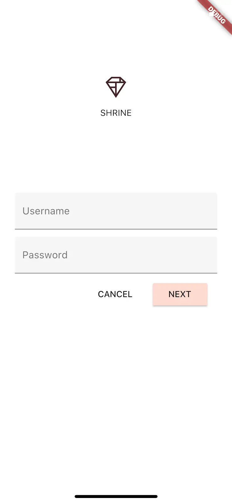 成功!上一篇教程中 Shrine 的登陆页面应该在你的模拟器中运行了。你可以看到 Shrine 的 logo 和它下面的名称 "Shrine"。