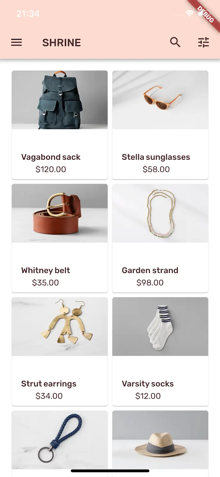 在教程 MDC-101 和 MDC-102 中,你使用 Material 组件(MDC)为一个名为 Shrine 的销售服装和家居用品的电子商务应用程序构建基础。这个应用的用户使用流程包括一个开始的登陆页面,然后导航用户前往展示商品的主屏幕。