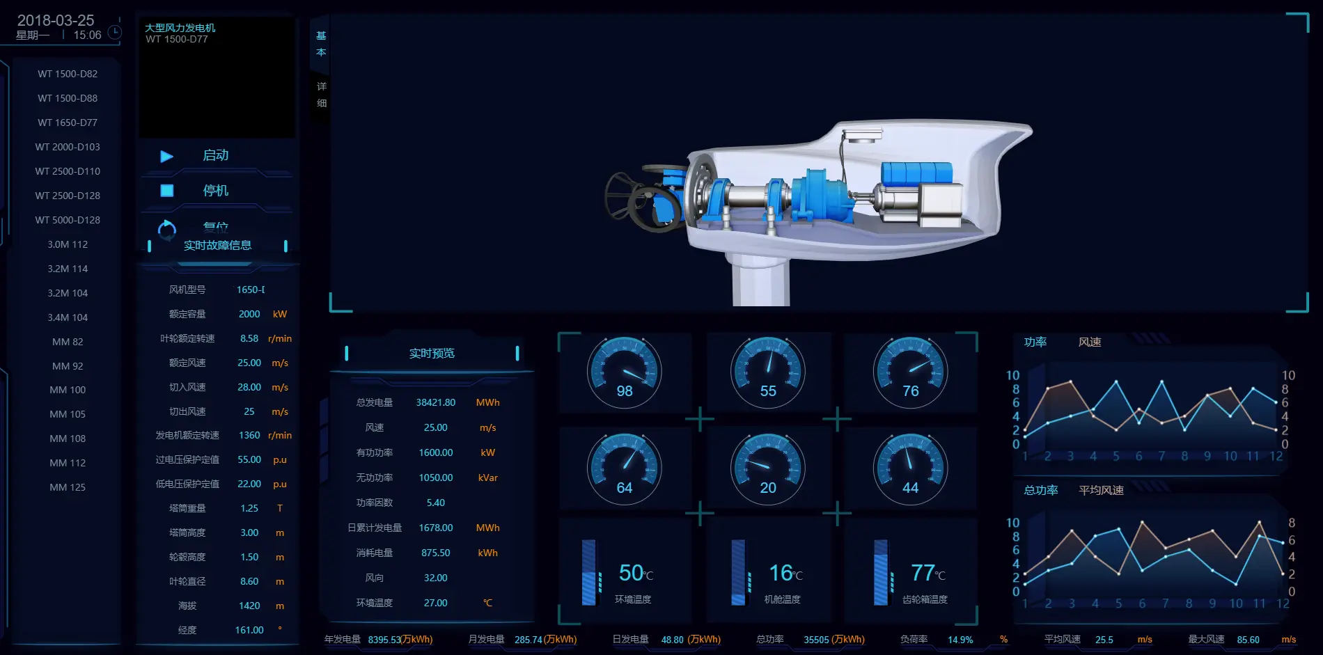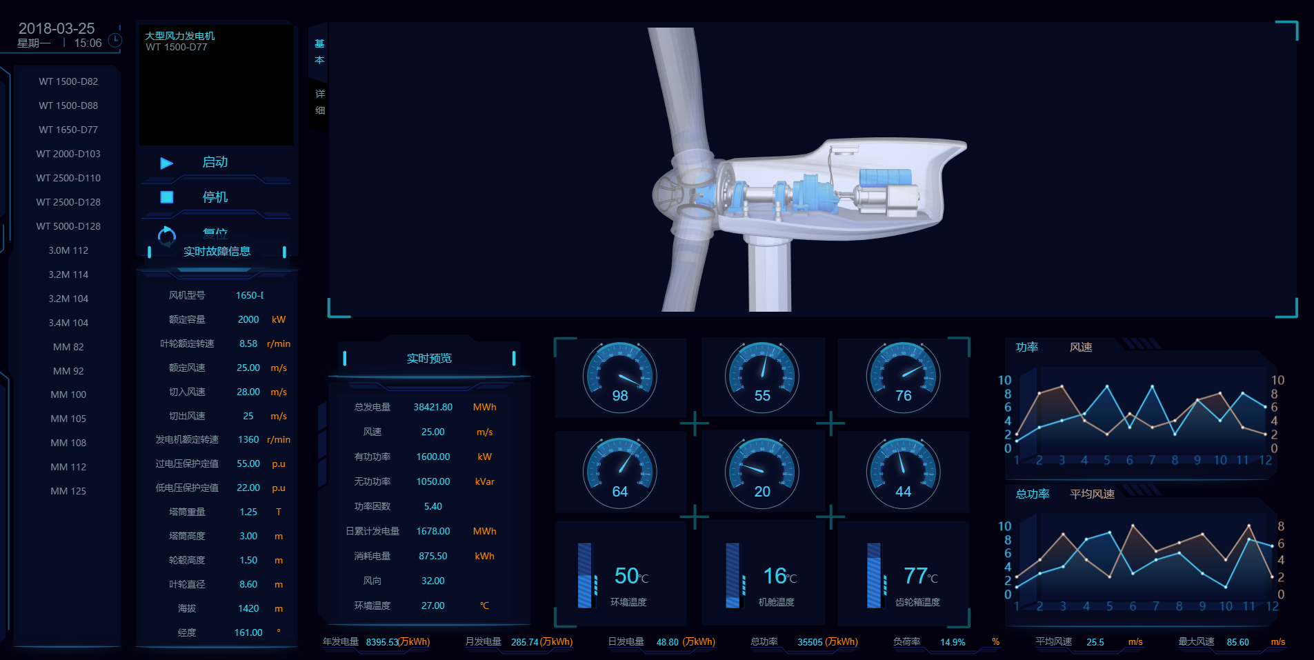 在这个页面中非常具体而又全面的展示了风机设备的相关设备信息,比如风机设备名称,风机参数,发电量数据,机舱温度以及功率风速折线图表等等,这对于管理员而言是一种享受!