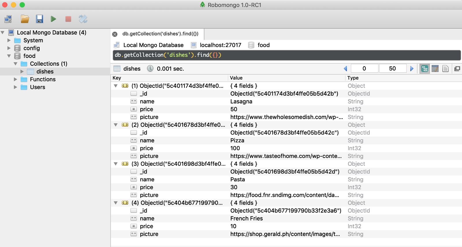 [ { "name": "Lasagna", "price": 50, "picture": "https://www.thewholesomedish.com/wp-content/uploads/2018/07/Best-Lasagna-550.jpg", "id": "5c401174d3bf4ffe05b5d42b" }, { "name": "Pizza", "price": 100, "picture": "https://www.tasteofhome.com/wp-content/uploads/2017/10/Chicken-Pizza_exps30800_FM143298B03_11_8bC_RMS-2.jpg", "id": "5c401678d3bf4ffe05b5d42c" }, { "name": "Pasta", "price": 30, "picture": "https://food.fnr.sndimg.com/content/dam/images/food/fullset/2011/2/4/1/RX-FNM_030111-Lighten-Up-012_s4x3.jpg.rend.hgtvcom.616.462.suffix/1382539856907.jpeg", "id": "5c401698d3bf4ffe05b5d42d" }, { "name": "French Fries", "price": 10, "picture": "https://shop.gerald.ph/content/images/thumbs/0003743_french-fries_340.jpeg", "id": "5c404b677199790b33f2e3a6" } ]You can make however many entries with whatever dishes!