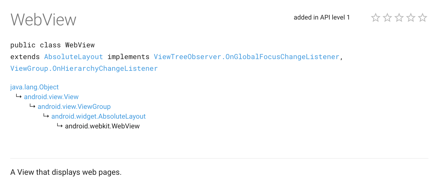 总结下来就一句话:WebView 就是个用于展示页面的 View。可以看到 android.webkit.WebView 继承自 android.view.View,只要接触过一些 native 的东西,大致就知道它是类似 div 一样的东西。View 本身是 widget 的基类,而 widget 就是用来创建交互 UI 的组件(如按钮、文字域之类)。