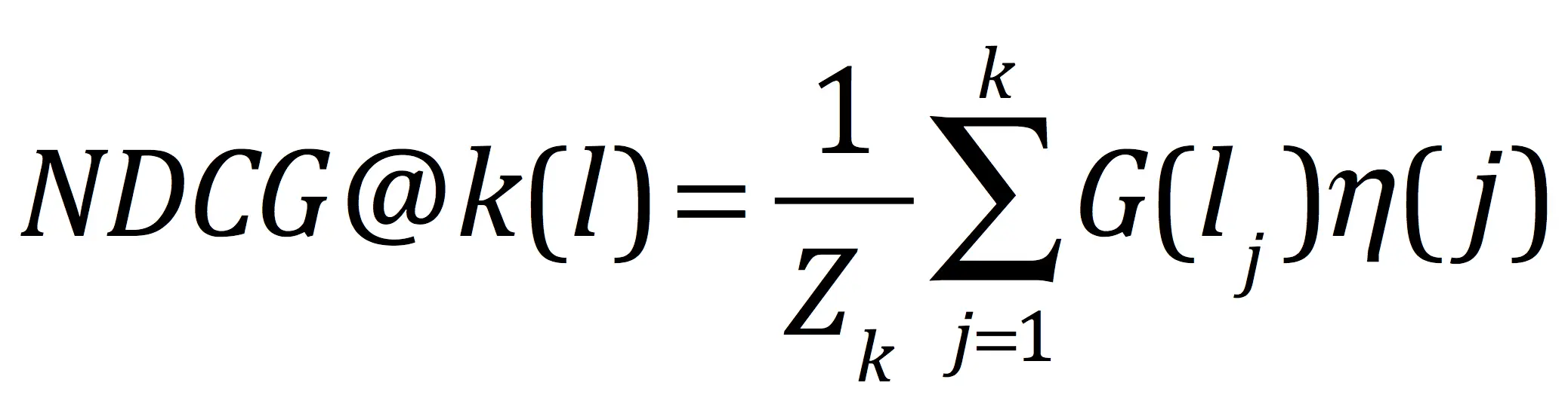 累加部分为DCG(Discounted Cumulative Gain)表示按照位置折损的收益,对于Query下的结果列表l,函数G表示对应Doc的相关度分值,通常取指数函数,即G(lj)=2lj-1(lj表示的是相关度水平,如{0,1,2});函数 η 即位置折损,一般采用 η(j)=1/log(j+1),Doc与Query的相关度越高且位置越靠前则DCG值会越大。另外,通常我们仅关注排序列表页前k位的效果,Zk 表示 DCG@k 的可能最大值,以此进行归一化处理后得到的就是NDCG@k。