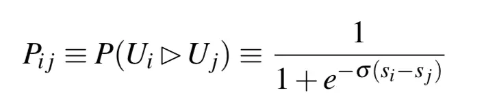 要了解Lambda梯度需要引入LambdaRank。LambdaRank模型是通过Pairwise来构造的,通常将同Query下有点击样本和无点击样本构造成一个样本Pair。模型的基本假设如下式所示,令Pij为同一个Query下Doci相比Docj更相关的概率,其中si和sj分别为Doci和Docj的模型得分: