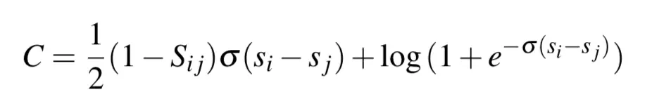 使用交叉熵为损失函数,令Sij表示样本Pair的真实标记,当Doci比Docj更相关时(即Doci有被用户点击,而Docj没有被点击),有Sij=1,否则为-1;则损失函数可以表示为: