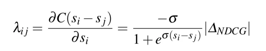 到目前为止,损失函数的计算过程中并未考虑样本所在的位置信息。因此进一步对梯度进行改造,考虑Doci和Docj交换位置时的NDCG值变化,下式即为前述的Lambda梯度。可以证明,通过此种方式构造出来的梯度经过迭代更新,最终可以达到优化NDCG的目的。