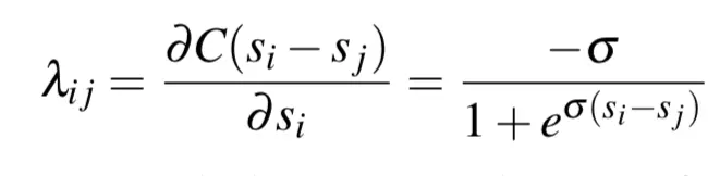 在构造样本Pair时,我们可以始终令i为更相关的文档,此时始终有Sij≡1,代入上式并进行求导,则损失函数的梯度为: