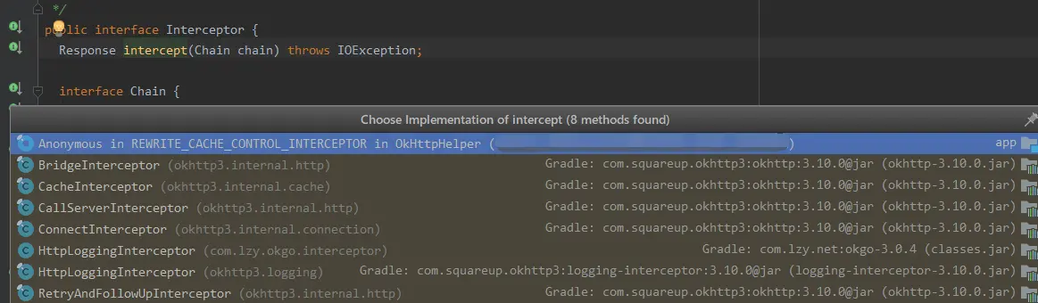 上述代码中可以看出Interceptor是个接口类,RealInterceptorChain实现了Interceptor.chain方法,在这里我们也看到了之前我们初始化时传进来的参数,可见我们实际调用的是RealInterceptorChain的proceed方法,接着往下看
