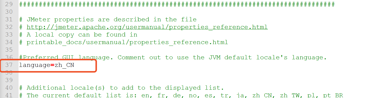 打开 bin 文件夹下的 jmeter.properties 文件 language 修改为:zh_CN,同时把前边的#去掉,如下图