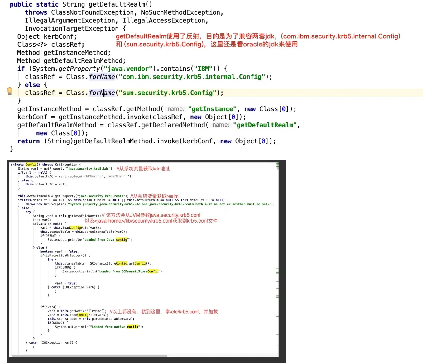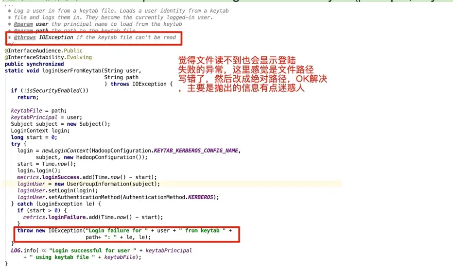 有两种方法:loginUserFromKeytab:调用checkTGTAndReloginFromKeytab来更新凭证,直接使用 keytab文件以及principal调用实现。 getLoginUser:需要自己实现凭证,并起另一个线程实现周期性凭证更新,麻烦 所以使用loginUserFromKeytab来实现认证 这里报了:Can't get Kerberos realm 跟着 UserGroupInformation.setConfiguration(configuration)方法走,一步一步看源码就行,这里说两个关键点吧
