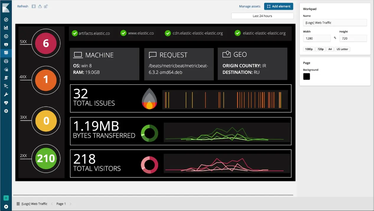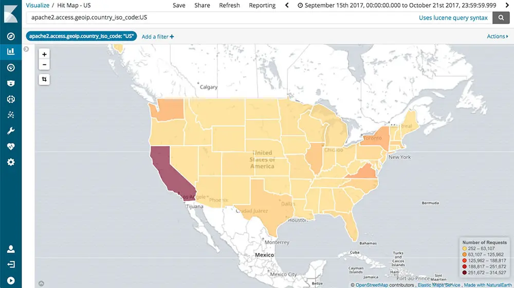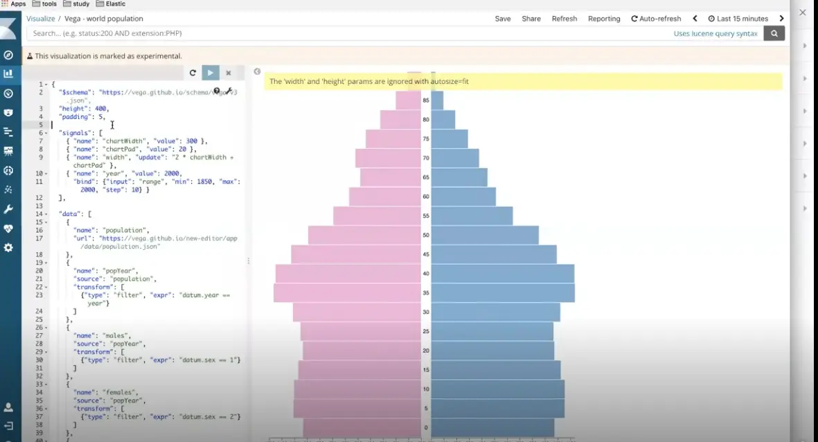 Kibana 核心产品搭载了一批经典功能:柱状图、线状图、饼图、旭日图,等等。不仅如此,您还可以使用 Vega 语法来设计独属于您自己的可视化图形。所有这些都利用 Elasticsearch 的完整聚合功能。