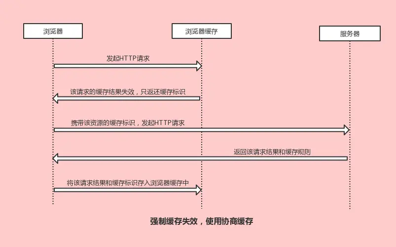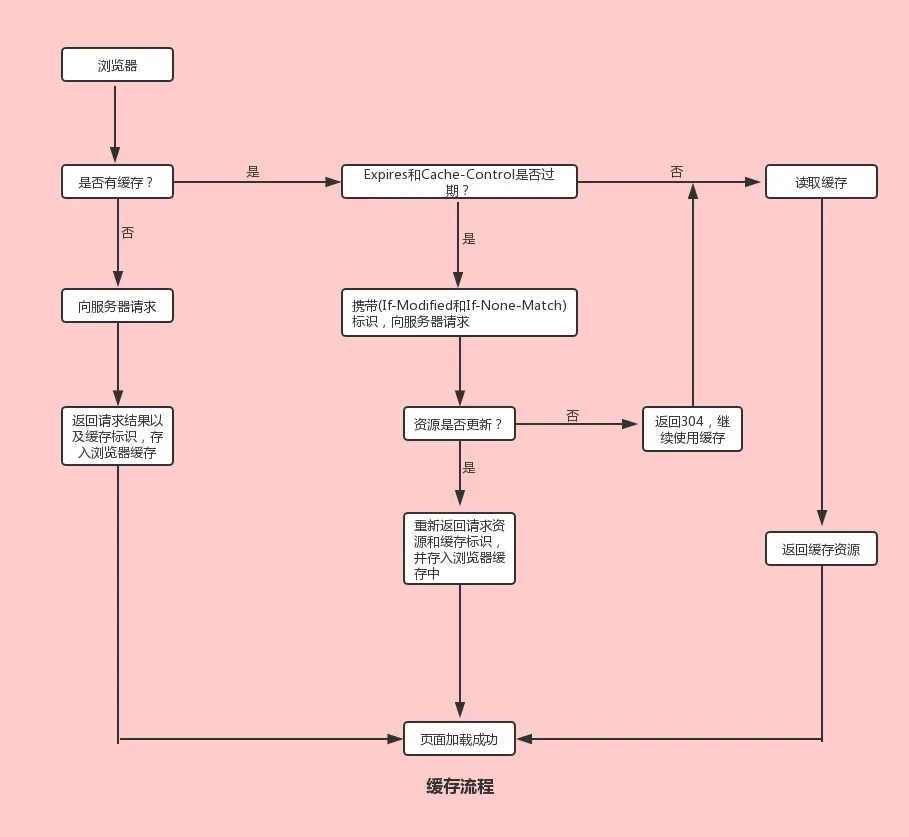 强制缓存优先于协商缓存进行,若强制缓存(Expires和Cache-Control)生效则直接使用缓存,若不生效则进行协商缓存(Last-Modified / If-Modified-Since和Etag / If-None-Match),协商缓存由服务器决定是否使用缓存,若协商缓存失效,那么代表该请求的缓存失效,重新获取请求结果,再存入浏览器缓存中;生效则返回304,继续使用缓存,主要流程程如下: