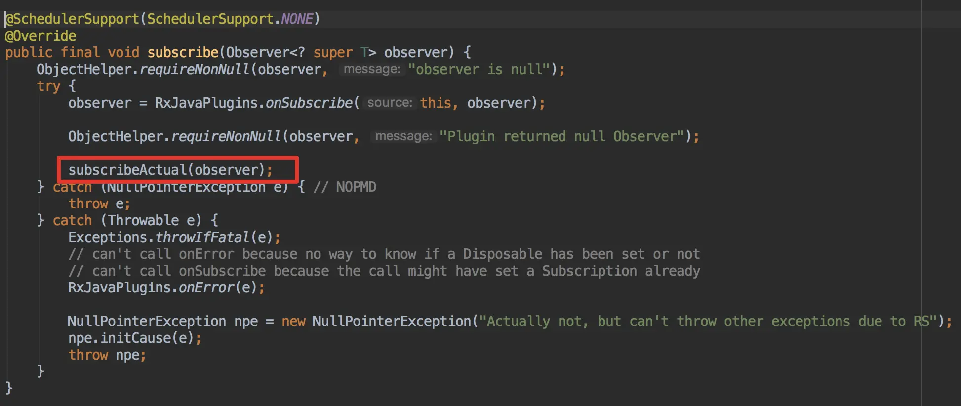 所以其实真正执行的顺序是从下往上,即调用了subscribe(observer)才会触发上一级的subscribeActual直到初始ObservableCreate。