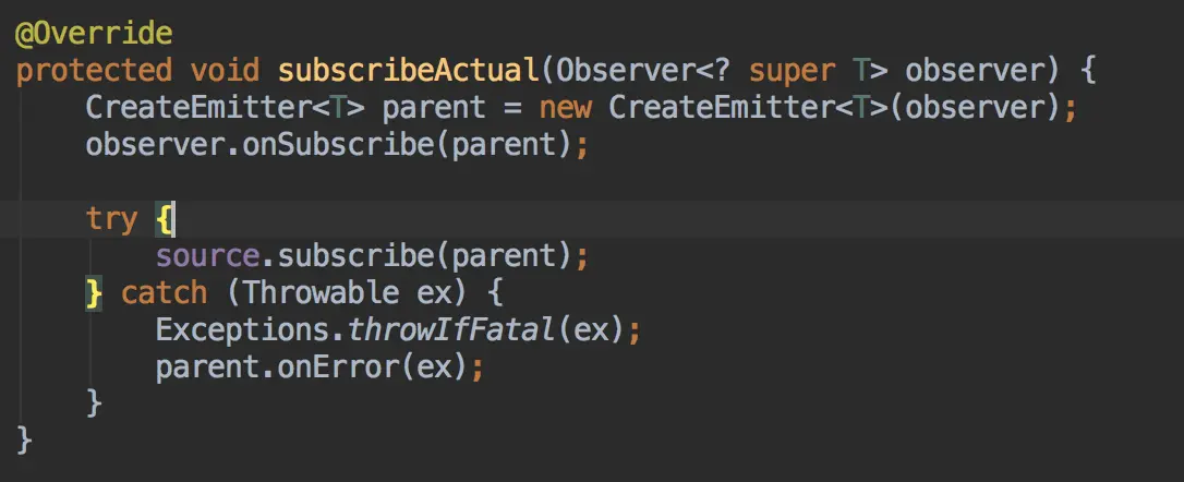 最终调用的是subscribeActual抽象方法,他的实现在类ObservableCreate中,回顾一下ObservableCreate代码