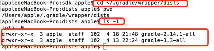 Gradle是大家共用的,当然不会把Gradle放在项目文件中(不是不可以),AS将gradle保存在下面的目录:~/.gradle/wrapper/dists ,保存之后不需要解压!如下图所示。所以,你可以修改gradle-wrapper.properties决定你要使用gradle版本。那么重新启动andriod studio这三个问题就解决了!