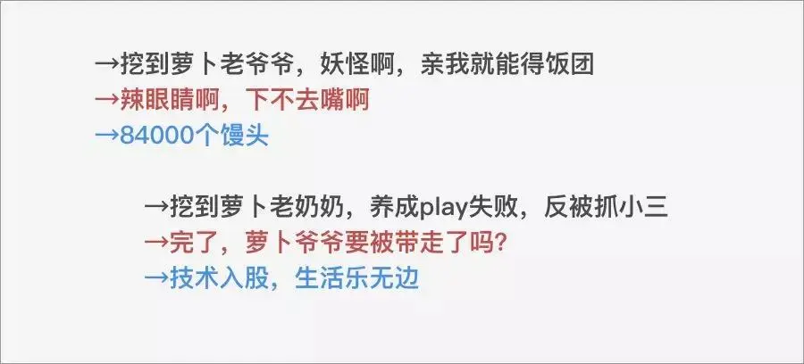 这里强调文案的作用在于,只有通过文案埋下伏笔、藏好惊喜,才能在两个故事间激发灵感的火花,让用或户恍然大悟、或会心一笑、或拍案而起……