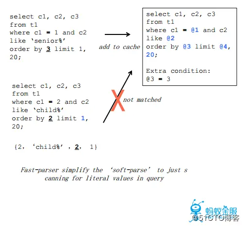 可以看到,在计划缓存中对于查询语句会进行参数的模糊匹配,但对于特定含义的参数会加入限定条件,比如order by 3中的参数3代表是第三列,该参数的修改可能会导致计划缓存的不适用,因此存储计划缓存时加入了限定条件@3 = 3。
