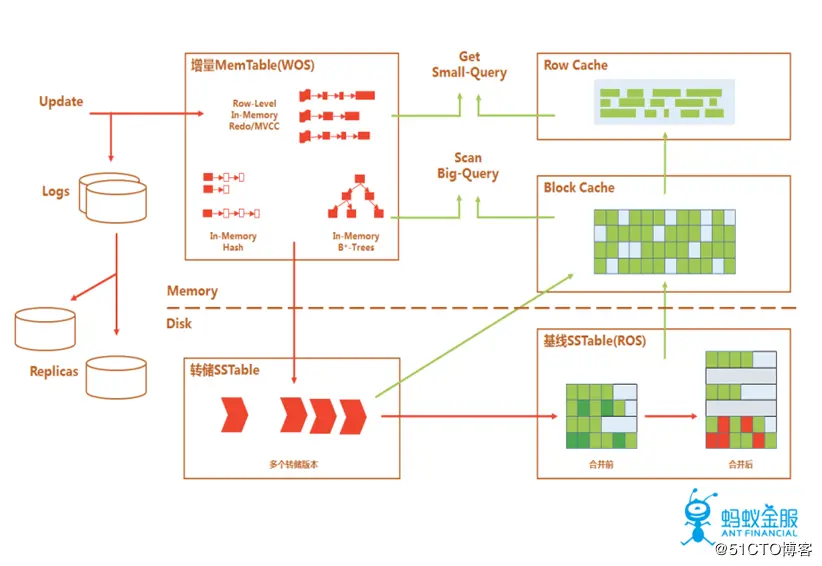 3. 存储引擎 OceanBase采用的存储引擎是经典的LSM-Tree架构,数据主要分为两个部分,分别是是存储于硬盘的基线数据(SSTable)以及存储于内存的增量数据(MenTable)。在该存储引擎中,所有数据的增删改操作都会在内存中进行,并形成增量数据,每隔一段时间将增量数据和基线数据进行合并,来避免对于SSD的随机写。因为对于数据库的操作为全内存操作,所以DML操作的效果非常好,但如果某一段时间的数据修改操作非常多,数据量过大,导致内存溢出,在这种情况下OceanBase提供了相应的解决方案,即转储操作,转储会将数据移动至硬盘上,但不会进行数据的合并操作,在后续合并时,会同时对增量数据,基线数据和转储数据一起进行合并。可以看出这个架构会面临一个很大的挑战,即在进行增删改的操作后,再进行查询操作,可能需要对基线数据和增量数据进行融合,因此在该架构下,读操作可能会受到一定的时间惩罚,这也是SQL优化器需要进行考虑的问题。事实上如果优化器不是基于自身架构和业务需求来进行开发的,可能不会获得良好的效果,这也是为什么要自研数据库的另一个理由。
