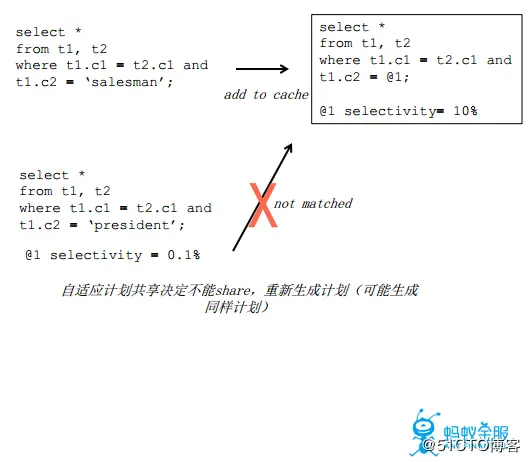 6.自适应共享计划 对于一个查询语句只要参数相似就一定能进行计划缓存的匹配吗?答案是否定的,举一个例子,在一个查询语句中对于salesman因为数据量较大,会采用全表扫描的方式进行查询,而对于president,因为数据量非常少,可能通过索引的方式进行查询的代价要比全表扫描的代价更好,因此对于这种情况,同样需要加入相应的限定条件。但重新生成的计划可能和原有计划相同,发生这种情况后,便会对于原有的限定条件进行修改,方便之后的查询语句进行计划匹配,以此来达到自适应计划共享。