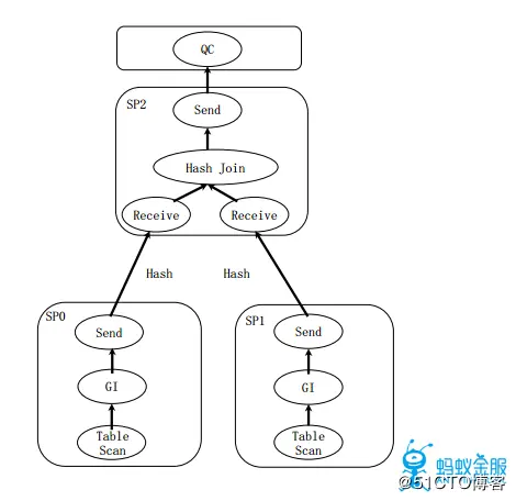 2.两级调度 在OceanBase中通过下面所述的方式形成两级调度。即将查询涉及到的各个机器上分别创建一个执行节点(SQC),来让主控节点(QC)控制SQC,其中QC为机器级的控制,SQC为线程级的控制。QC进行全局调度,依据总并行度分配各节点各子计划并行度, SQC进行本机调度,其中各节点独立决定水平并行粒度及执行。