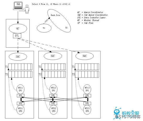优化器和执行引擎是相辅相成的,优化器所能优化的计划取决于执行引擎的执行计划。 1.并行执行 并行执行的概念就是分治,分治包括垂直分治(比如拆分计划为子计划单元)和水平分治(比如GI(Granule Iterator)获取扫描任务),并行执行主要用于OLAP场景中,解决查询RT时间的问题,这在很多在线分析的场景下是十分必要的。RT时间对于RDBMS查询是一个重要指标,传统的Map-Reduce的执行性能并不能满足OLAP的性能需求,因此如何找到高效的执行计划及数据流水线非常关键。在OceanBase中采用两级调度,自适应的子计划调度框架,各节点独立的任务切分等方案来进行并行执行。对于数据重分布,OceanBase支持大多数常见的数据分布,包括Hash, Broadcast/Replicate,,Round Robin,Merge Sort等。