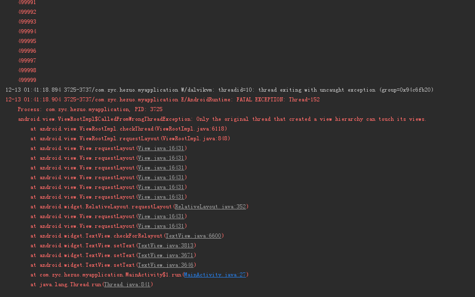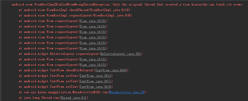 当点击按钮更新UI的时候就会发现报了异常,异常如下