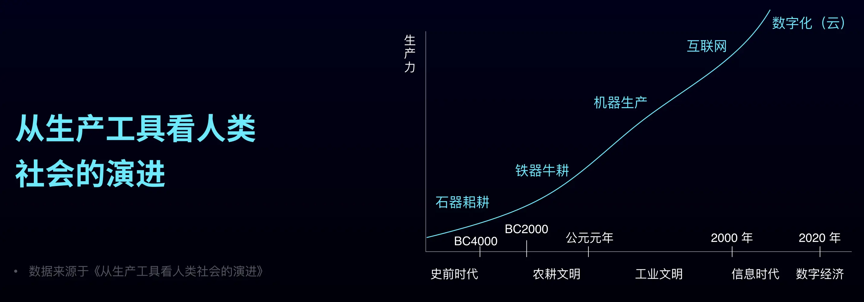首先我们看这张图,图上展现了从人类社会初始阶段开始,一直发展到现代数字时代,所经历的几次生产力的飞速提升,这里可以清晰的看到生产力和生产工具之间的关系——在石器时代,工具以简单的木石结合为主,简陋的工具带来的生产力是非常有限的。之后锻造技术出现,给人类带来了更加高效的金属工具,原来需要一天的活半天就干完了,人们开始有空闲时间,闲着闲着,文明就诞生了。随着科技的发展,蒸汽机和电力拉开了机器生产时代的序幕,二十世纪成为了世界发明史上最璀璨的一个世纪。到了 2000 年,互联网让距离消失,把很多不可能变成了可能。而未来,云技术和数字化的浪潮,注定会掀起新一轮的生产力革命。