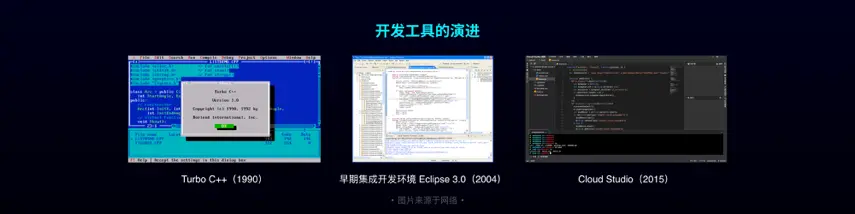 这里展示的是不同时代的集成开发环节,是程序员每天都要用到的开发工具。这个工具的演化进程,最左边是 90 年代,DOS 时代的开发工具,非常基础,只有文字,连光标都没有。再往后,中间这张图展现的是 04 年左右的开发工具,此时已经有了完备的图形界面和辅助功能,但是仍局限于物理设备。到了近年,编程工具开始云端化,出现了 Cloud Studio 这样的数字化时代的云端工具产品,