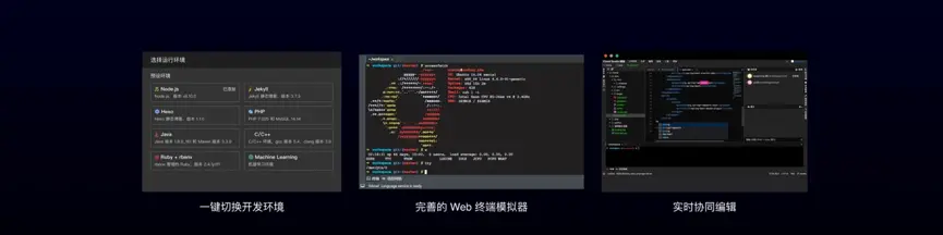 比如说随意切换开发环境,你可以从编写 Java 的开发环境瞬间切换到编写 Python 的开发环境;再比如说可以通过 Web 终端连接到任意的云端计算资源,瞬间获得大量计算能力;再比如说邀请伙伴一起编写程序,两个人可以同时编写同一份代码等等。