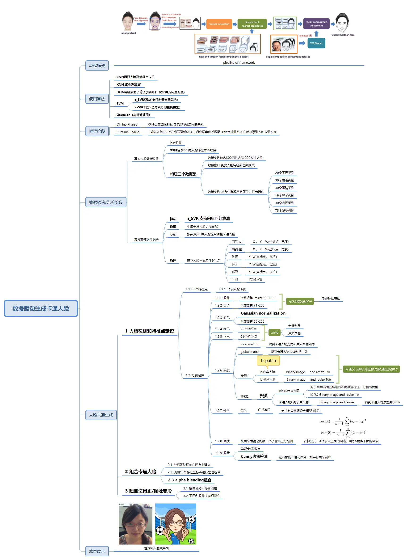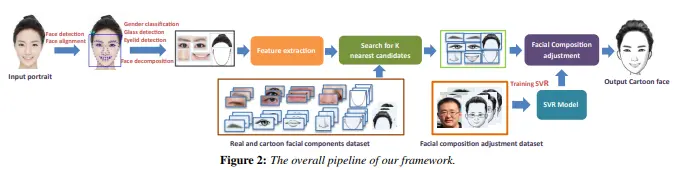 我们首先将输入面解析为其语义面部组件。对于每个组件,我们提取其形状特征并按功能查找数据集中最相似的实际组件 匹配。然后,我们使用相应的风格化面部组件来构成卡通脸。最后,我们自动调整面部组成的卡通面部,更自然,更有吸引力