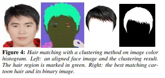 第一步过程,得到K近邻发型。这一步跟上面眉毛部位的计算方法类似:首先就是对卡通图和真实图进行阈值分割,得到二值化图像,并进行图像大小归一化,具体归一化的图片大小文章没有具体详细说明;最后对归一化图像进行分块,统计每个块的颜色信息总和xi,并以(x1,x2……xn)作为特征向量,计算特征向量间的欧式距离。这样我们可以得到k近邻发型,。