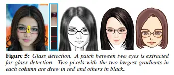 对于是否戴眼镜,paper首先在眼镜的中间位置取一块区域,然后对把这一块区域转换成灰度图像,最后计算垂直方向上的梯度值。