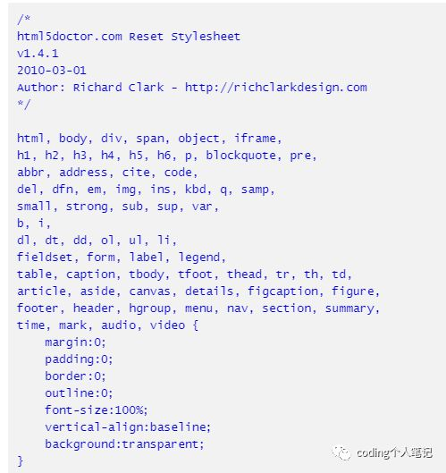 这款初始化CSS,会造成很多是冗余的,像abbr、hgroup、figure等标签,我到现在为止都没用过,甚至没听过,所以这样的初始化CSS是不合理的。