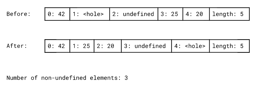 第二个预处理步骤是去孔(hole)。V8引擎会将排序范围中的所有元素都移动到对象的开头。之后移动 undefined。这在某种程度上其实是规范所要求的,因为规范要求引擎始终将undefined排序到最后。这样nbbbb,undefined永远都不会作为的参数去调用用户提供的比较函数。在第二个预处理步骤之后,排序算法只需要考虑 非undefined的,这可以减少实际排序的元素的数量。