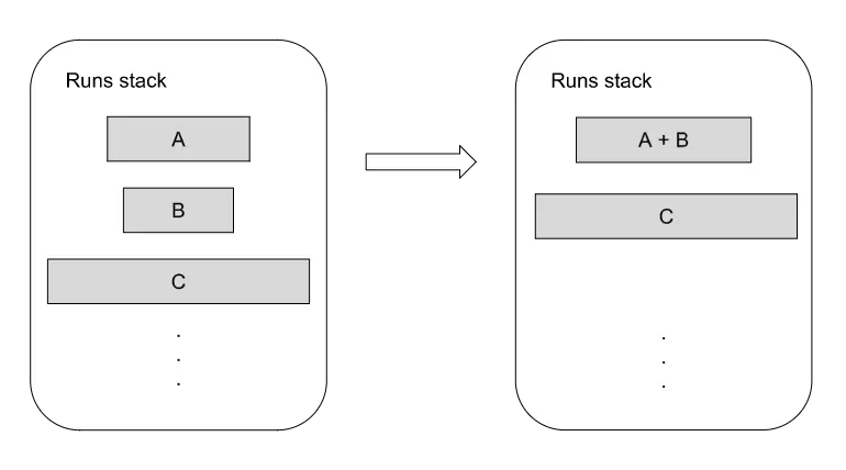 找到的 runs在一个栈中追踪,这个栈会记录起始的索引位置和每个run的长度。栈上的run会逐渐合并在一起,直到只剩下一个排序好的run。在确定合并哪些run时,Timsort会试图保持两方面的平衡。一方面,您希望尽早尝试合并,因为这些run的数据很可能已经在缓存中,另一方面,您希望尽可能晚地合并,以利用数据中可能出现的某些特征。为了实现这个平衡,Timsort遵循保两个原则。假设A,B和C是三个最顶级的runs: