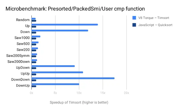 下一个图表显示了:在处理已完全排序的数组,或者具有已单向排序的子序列的数组时,Timsort对性能的影响。下图中采用Quicksort作为基线,展示了Timsort的加速比(在“DownDown”的情况下高达17倍,这个场景中数组由两个反向排序的子序列组成)。可以看出,除了在随机数据的情况下,Timsort在其它所有情况下都表现得更好,即使我们排序的对象是PACKED_SMI_ELEMENTS(Quicksort在上图的微基准测试中对这种对象排序时,性能胜过了Timsort)。