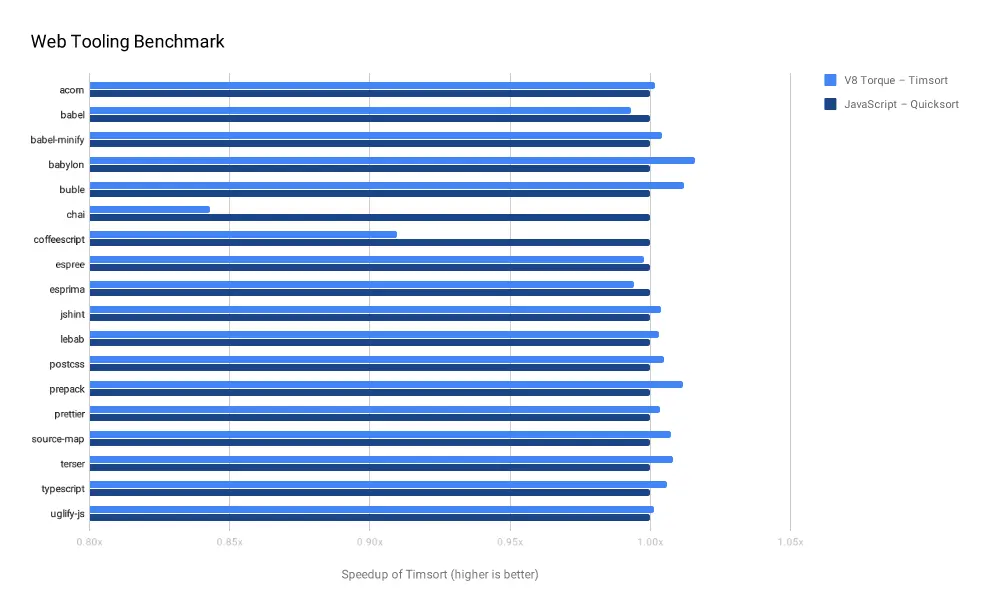 Web Tooling Benchmark是在Web开发人员常用工具的JS环境载体(如Babel和TypeScript)中进行的测试。下图采用JavaScript Quicksort作为基线,展示了Timsort的速度提升。除了 chai 我们在几乎所有测试中获得了相同的性能。