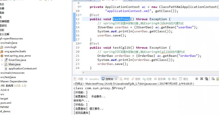 package test.spring_aop_anno; import org.aspectj.lang.ProceedingJoinPoint; public interface IUserDao { void save();} // 用于测试 CGLIB 动态代理class OrderDao { public void save() { //int i =1/0; 用于测试异常通知 System.out.println("保存订单..."); }} //用于测试 JDK 动态代理class UserDao implements IUserDao { public void save() { //int i =1/0; 用于测试异常通知 System.out.println("保存用户..."); }} //切面类class TransactionAop { public void beginTransaction() { System.out.println("[前置通知] 开启事务.."); } public void commit() { System.out.println("[后置通知] 提交事务.."); } public void afterReturing() { System.out.println("[返回后通知]"); } public void afterThrowing() { System.out.println("[异常通知]"); } public void arroud(ProceedingJoinPoint pjp) throws Throwable { System.out.println("[环绕前:]"); pjp.proceed(); // 执行目标方法 System.out.println("[环绕后:]"); }}