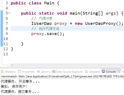 package test.staticProxy; // 接口public interface IUserDao { void save(); void find();} //目标对象class UserDao implements IUserDao{ @Override public void save() { System.out.println("模拟:保存用户!"); } @Override public void find() { System.out.println("模拟:查询用户"); }} /** * 静态代理 * 特点: * 2. 目标对象必须要实现接口 * 2. 代理对象,要实现与目标对象一样的接口 */class UserDaoProxy implements IUserDao{ // 代理对象,需要维护一个目标对象 private IUserDao target = new UserDao(); @Override public void save() { System.out.println("代理操作: 开启事务..."); target.save(); // 执行目标对象的方法 System.out.println("代理操作:提交事务..."); } @Override public void find() { target.find(); }}