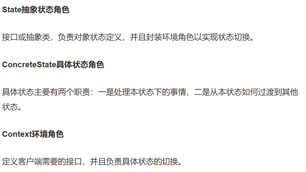 - state角色负责处理当前状态的实现和切换下一个状态——每一步逻辑的具体实现
