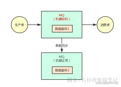 但是万一天有不测风云,MQ部署的那台机器,因为一些莫名的原因,MQ自己本身的进程挂掉了,或者是那台机器直接就宕机了,那么此时怎么办呢?
