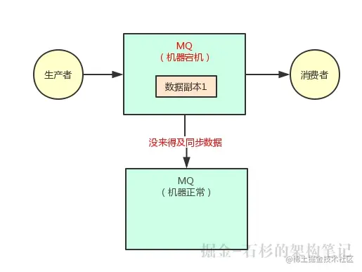 但凡刚写一台机器他就宕机,还没来得及复制到另外一台机器的话,本次写应该报错失败,然后你应该重试再次写入数据到MQ集群里去。