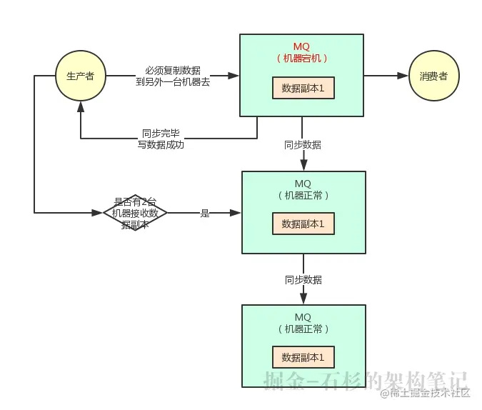 所以对于采用这种机制的时候,你必须得让生产者通过一些参数的设置,保证说写一条消息到某台机器,他必须同步这条消息到另外一台机器成功,集群里有双副本了,然后此时才可以认为这条消息写成功了。