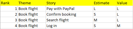 A theme can be thought of as an additional attribute of the stories. Normally, several stories share the same theme. The story “Search flight” could have the theme “Book flight”. A snippet from the backlog could look like this: